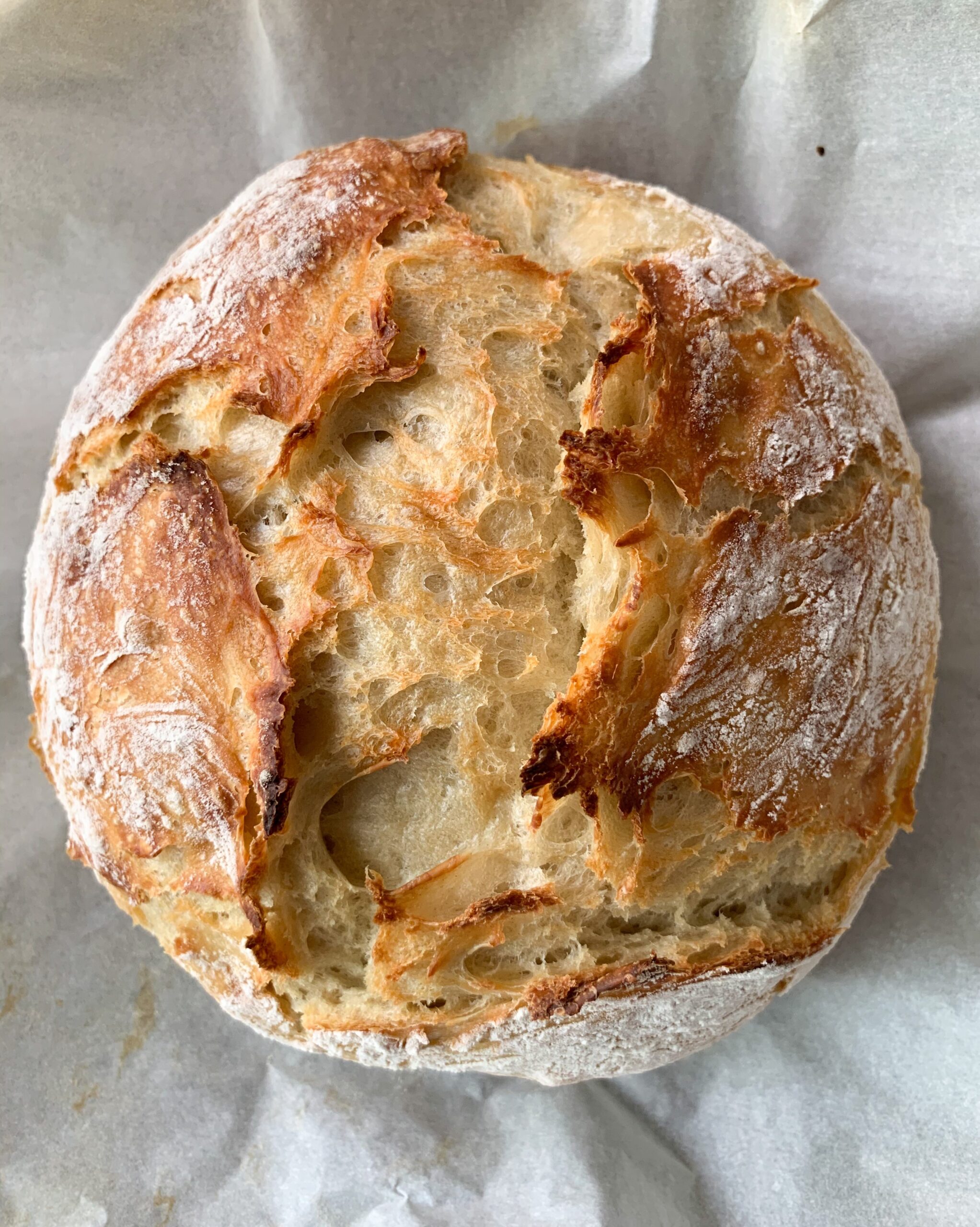 Place the cover back on the Dutch oven and place in the preheated oven on the center rack. Bake for 35 minutes at 450 degrees F (40 minutes if dough was cold from the fridge). Remove the lid and bake for another 5-10 minutes, until a golden brown color forms- longer if necessary. Remove the loaf from the dutch oven (grabbing the sides of the parchment paper works well here) and place it on a wire rack or cutting board to cool for at least 10 minutes (preferably 30 minutes – an hour, if you have time) before slicing.