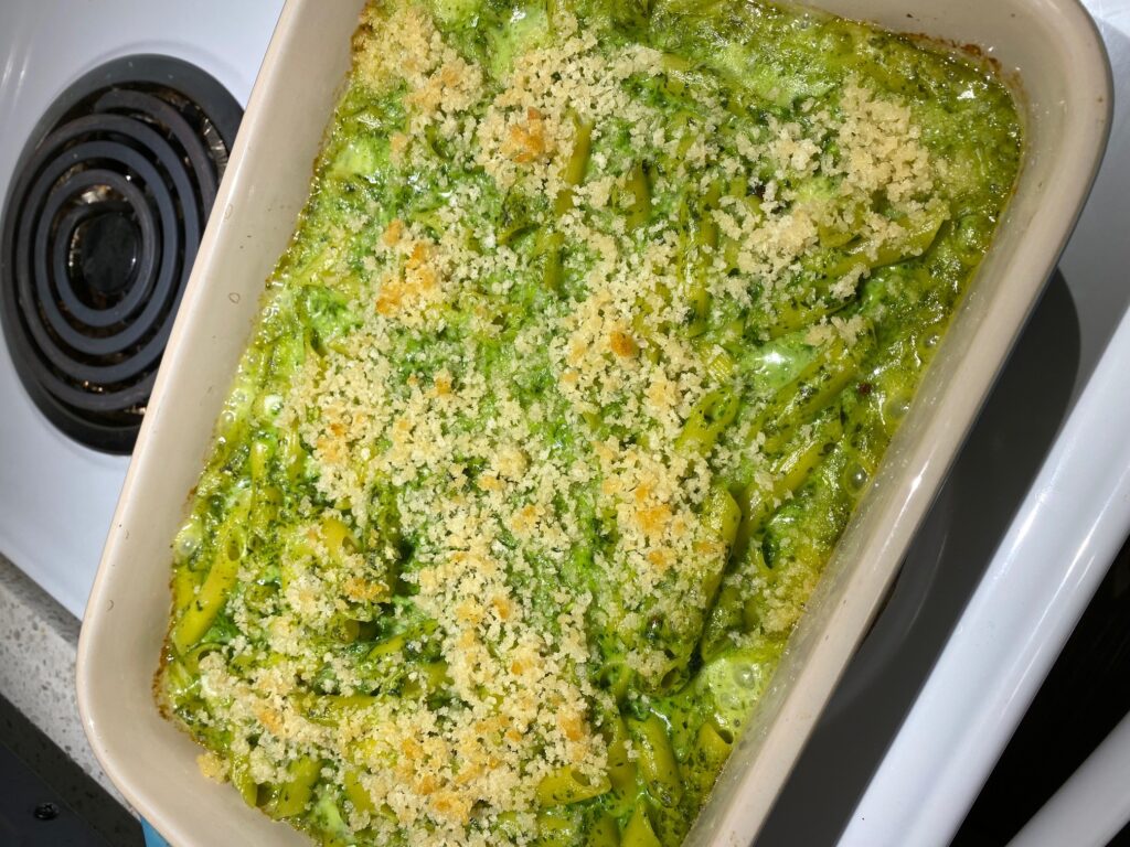 Add the cooked penne to the cheese sauce, making sure every noodle is covered in sauce. Next, stir in the pureed greens until barely combined. Pour the pasta mixture into the buttered baking pan and top evenly with the breadcrumbs. Bake until bubbly and golden brown, 20 to 25 minutes.