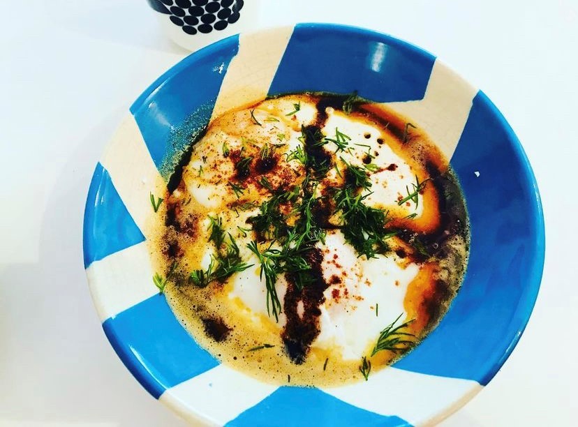 Mix yogurt with crushed garlic cloves and salt to taste. Heat up the oil and mix the red pepper flakes, set aside. Spoon the yogurt in a bowl, place the poached egg and top with the red pepper oil mixture. Top with fresh dill and eat with crusty bread.