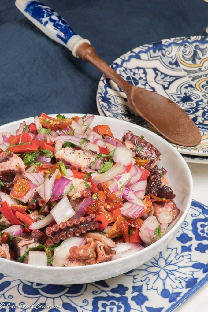 4. Remove the octopus and place on a cutting board, cut into bite size pieces. Place the cut pieces onto a baking tray and add in the rest of the salad ingredients, the red onion, red pepper, sun dried tomatoes and cilantro. Mix it up with the octopus and squeeze over the juice of one lime. Drizzle about 1/4 of a cup of very good olive oil and then season with salt and pepper. Mix it all together and serve.