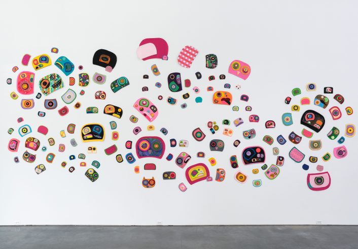 Carefully cut, stitched, and beaded by hand, Vickers’ delightful series of felt ovoids has been steadily growing since she started making them in 2017. Resulting from this ongoing daily practice, each layered ovoid is a completely unique composition and configuration of colours in a playful palette.