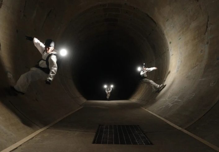 At the heart of the exhibition is rode work ver. under city, a multi-channel video installation. Created in collaboration with renowned skate film crew Far East Skate Network, the work captures skaters navigating Tokyo’s subterranean environments—including stormwater basins, disused transit tunnels, and maintenance corridors. These movements transform utilitarian spaces into expressive terrains, linking isolated structures into a speculative, virtual undercity.
